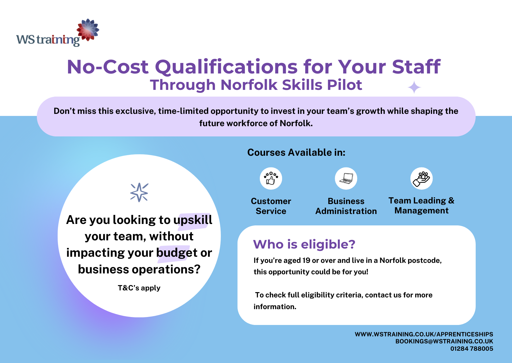 As part of Norfolk County Council’s Adult Skills Fund Pilot, WS Training is delivering fully funded, accredited qualifications to help employers like you build a more confident, skilled workforce.